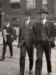 Ternos de Três Peças: Os homens usavam ternos de três peças compostos por paletó, colete e calças. As lapelas eram largas e os coletes frequentemente ajustados.